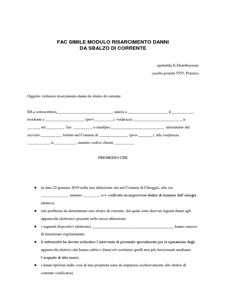 Fac simile richiesta risarcimento danni da sbalzo di corrente in relazione ai fatti e motivi come sopra esposti, il sottoscritto, ai sensi dell'art. 2043 codice civile, con la presente richiede alla vostra società, il risarcimento di tutti i danni subiti in relazione all'evento descritto, che quantifica nella somma complessiva di €_______________ (oppure di tutti i danni subiti in relazione all'evento …