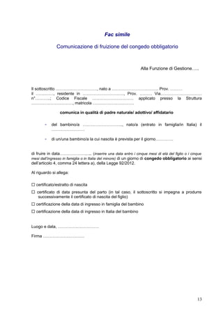 PDF MOD. 32 - DOMANDA DI CONGEDO PARENTALE - Ferrara non ha usufruito né usufruisce di periodi di congedo parentale; o in alternativa o non ha diritto a congedo parentale in quanto: lavoratore autonomo; non lavoratore. Il/La sottoscritto/a è consapevole che: è soggetto alle sanzioni previste dal codice penale e dalle leggi speciali in materia qualora rilasci Modulo richiesta congedo di paternità: fac simile DOC, PDF Il modello in questione serve a richiedere il congedo di paternità obbligatorio (ed eventualmente facoltativo) direttamente al datore di lavoro. In pratica con questo modulo il lavoratore chiede al proprio datore di astenersi dal lavoro per via della nascita o dell'ingresso in famiglia (in caso di adozione/affidamento) di un minore. RICHIESTA DI CONGEDO PARENTALE dell'inizio del congedo L'istanza di fruizione di congedo parentale deve essere presentata, salvo casi di oggettiva impossibilità, almeno 5 gg. prima della fruizione (D.Lgs. n. 151/2001, Art. per il congedo a giorni, 2 gg prima per il congedo ad ore 32, c. 3.). Il congedo parentale può essere fruito anche in modo frazionato. Tra un periodo (anche solo di un Congedo matrimoniale: modulo richiesta, entro quando, assegno Leggi anche Come funziona il congedo parentale. Assegno congedo matrimoniale. La retribuzione erogata dall'INPS in caso di congedo matrimoniale è un diritto per gli operai, gli apprendisti, i lavoratori a domicilio, i marittimi di bassa forza, e i dipendenti da aziende industriali, artigiane, cooperative.