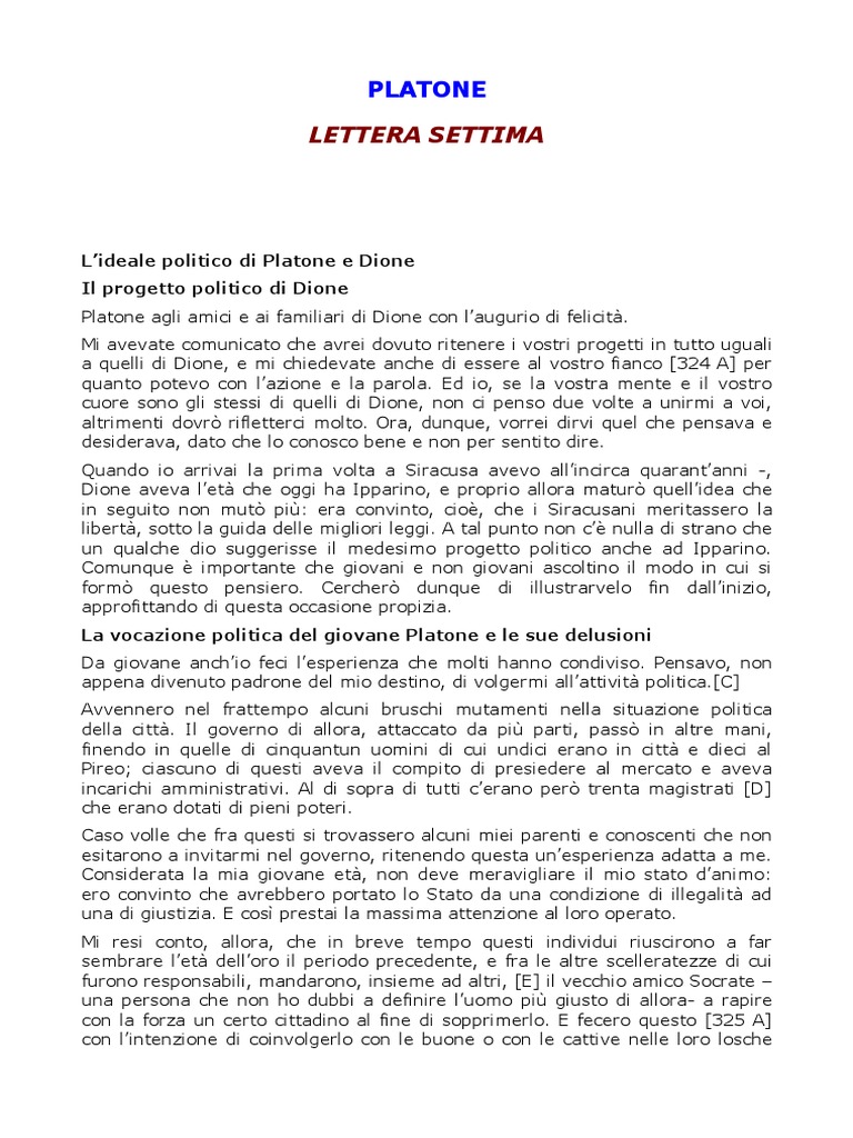 Platone, LETTERA VII, 324b-325a (Le prime esperienze ... - YouTube Esercizio di traduzione dal greco insieme a Platone che, in questo passo tratto dalla famosa Lettera VII, ci parla delle sue prime esperienze politiche. Per seguire meglio la lezione oppure...
